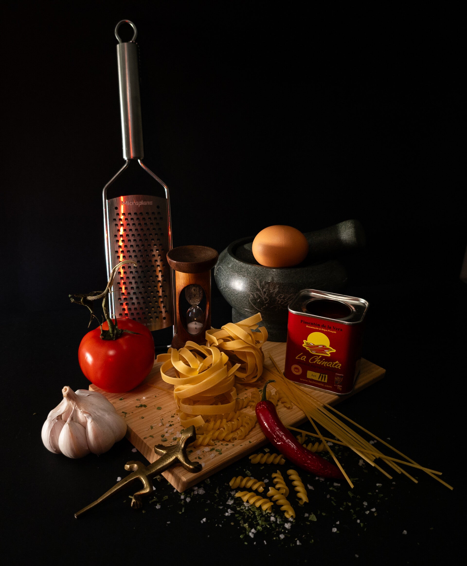 De gekozen objecten vertellen samen een verhaal. De pasta symboliseert ambacht en traditie, terwijl de tomaat zorgt voor levendigheid en energie. Knoflook voegt diepte toe, en het ei verwijst naar de basis van veel gerechten, maar ook naar het begin van iets nieuws. De vijzel en rasp staan voor het proces: het bewerken, verfijnen en aandacht geven aan wat je maakt.